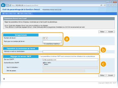 L'Outil de paramétrage de la fonction d'envoi vous aide à configurer les réglages de base pour l'envoi des e-mails. Au lieu de l'Outil de paramétrage de la fonction d'envoi, vous pouvez utiliser l'interface utilisateur distante pour configurer des réglages plus détaillés, par exemple pour l'authentification POP avant l'envoi ou pour la communication cryptée. Définition des paramètres de communication par e-mail ou I-Fax