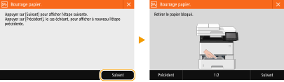 Retirez sans forcer le papier coincé de l'appareilLe retrait en force du papier risque d'endommager des pièces. Si vous ne parvenez pas à enlever le papier, contactez votre revendeur agréé Canon ou composez le numéro d'assistance téléphonique de Canon. Lorsqu'un problème ne peut pas être résolu