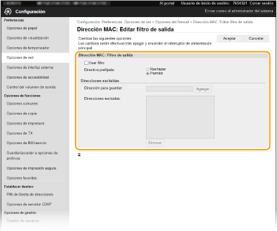 Seleccione la condición previa (directiva predeterminada) para permitir o rechazar la comunicación de otros dispositivos con el equipo y, a continuación, especifique direcciones MAC para las excepciones.