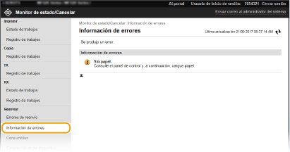 Después de iniciar sesión en el Modo de administrador del sistema, puede hacer clic en [Nº trabajo] para mostrar información detallada o para obtener una vista preliminar del documento que no se ha reenviado correctamente.