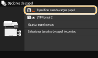 Una vez registradas las opciones de papel predeterminadas, la pantalla de configuración del papel no aparece cuando se carga papel, y se utiliza la misma configuración en todo momento. Si carga un tamaño o tipo de papel diferentes sin cambiar las opciones de papel, es posible que el equipo no imprima correctamente. Para evitar este problema, seleccione <Especificar cuando cargue papel> en el paso 3, y, a continuación, cargue el papel.
