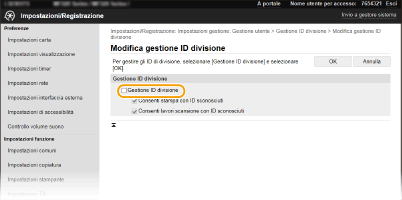 È inoltre possibile accedere alle impostazioni di Gestione ID reparto da <Menu> nella schermata Schermata princip.. <Gestione ID divisione>
