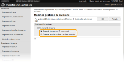 [Consenti stampa con ID sconosciuti]Per inviare un lavoro da un computer quando Gestione ID reparto è abilitato, è necessario inserire ID e PIN corretti (