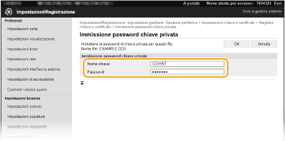 [Password] Immettere dei caratteri alfanumerici per la password della chiave privata impostata per il file da registrare.
