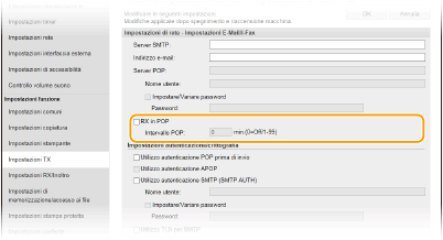 Imposta l'intervallo (in minuti) utilizzato per connettersi automaticamente al server POP3. Se sul server ci sono documenti I-Fax, questi vengono automaticamente ricevuti e stampati.