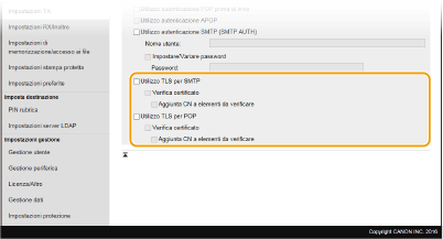 Selezionare la casella di controllo per crittografare il messaggio con il server POP3 utilizzando TLS. Selezionare le caselle di controllo [Verifica certificato] e [Aggiunta CN a elementi da verificare] secondo necessità.