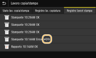 Se si verifica un errore, ad esempio quando la stampa non riesce o quando non è possibile inviare o ricevere un fax o un documento acquisito, il codice di errore corrispondente viene visualizzato in un rapporto o nella schermata del registro dei lavori come numero a tre cifre. Verificare quanto segue per individuare cause e soluzioni per ciascun codice di errore. Per istruzioni su come stampare un rapporto di errore e sulle informazioni contenute nel rapporto, vedere