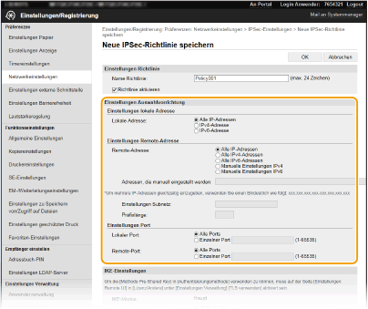 Wählen Sie diese Einstellung, wenn IPSec für alle an die und von der IPv6-Adresse des Geräts gesendeten IP-Pakete verwendet werden soll.