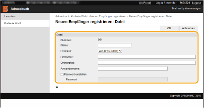 Sie können den Computer verwenden, um Empfänger im Adressbuch des Geräts zu registrieren und Informationen der registrieren Empfänger bearbeiten. Legen Sie hier den gemeinsamen Ordner oder die Adresse des FTP-Servers fest.