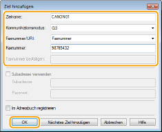 Wenn das Feld [Faxnummer bestätigen] oder [URI bestätigen] aktiv ist, geben Sie die entsprechende Nummer in das Feld ein. Die Einstellung zur Bestätigung der eingegebenen Nummern kann auf dem Faxtreiberbildschirm geändert werden. Weitere Informationen erhalten Sie nach Klicken auf [Help] auf dem Faxtreiberbildschirm.