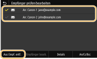 Aktivieren Sie das Kontrollkästchen für den zu löschenden Empfänger, und wählen Sie [Aus Empf. entf.].
