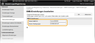 SMB (Server Message Block) ist ein Protokoll für die Freigabe von Ressourcen wie Dateien und Druckern für mehr als ein Gerät in einem Netzwerk. Das Gerät verwendet SMB zum Speichern gescannter Dokumente in einem gemeinsamen Ordner. Je nach Netzwerk müssen Sie eventuell den NetBIOS- und den Workgroup-Namen einstellen.
