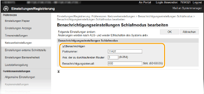Aktivieren Sie das Kontrollkästchen, wenn eine Geräteverwaltungssoftware über den Stromversorgungsstatus des Geräts benachrichtigt werden soll. Wenn Sie [Benachrichtigen] wählen, können Sie unnötige Kommunikationsversuche des Geräts während des Schlafmodus vermeiden und so den Stromverbrauch insgesamt senken. [Portnummer]