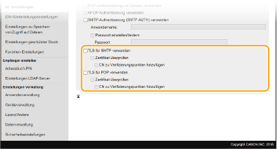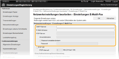Verwenden Sie vor dem Senden von E-Mails oder I-Faxen Remote UI, um die detaillierten Sende- und Empfangseinstellungen zu konfigurieren, wie die Einstellungen zur Verwendung des Geräts für das Senden und Empfangen von I-Faxen und die Einstellungen für die POP-Authentisierung und Verschlüsselung der Kommunikation. Die erforderlichen Einstellungen erhalten Sie von Ihrem Anbieter oder Netzwerkadministrator.