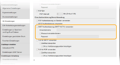 Wenn Sie SMTP-Authentisierung (SMTP AUTH) konfigurieren, erfolgt zum Zeitpunkt des Versands von E-Mail oder I-Fax eine Benutzeridentifizierung über Benutzername und Passwort.