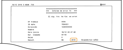 Si ocurre un error como, por ejemplo, si la impresión no se realiza correctamente o no puede enviar o recibir un fax o un original escaneado, el código de error correspondiente aparecerá en un informe o en la pantalla de registros de trabajo en forma de número de tres dígitos. Consulte la siguiente información para averiguar las causas y las soluciones de cada código de error. Para obtener información sobre cómo imprimir un informe de errores e información en el informe, consulte