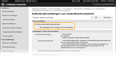 Er wordt geen authenticatiescherm weergegeven wanneer e-mail of een I-Fax wordt verzonden. Autorisatie wordt op de SMTP-server uitgevoerd met de gebruikersnaam en het wachtwoord die zijn ingesteld in [E-mail-/I-faxinstellingen] Communicatie-instellingen voor E-mail/I-Fax configureren.