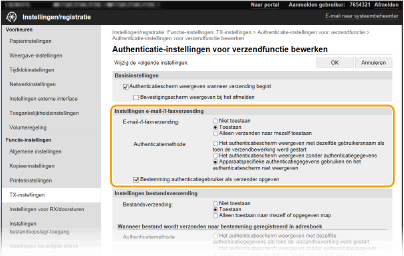 Er wordt geen verificatiescherm weergegeven bij het verzenden. Verificatie wordt op de server uitgevoerd met de gebruikersnaam en het wachtwoord ingesteld in het Adresboek.