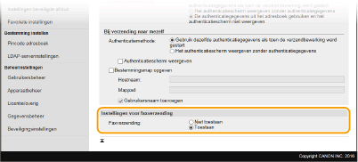 Blokkeert opslaan in alle gedeelde mappen en FTP-servers, die niet als mappen zijn opgegeven. De gegevens worden opgeslagen in mappen die geregistreerd zijn op de LDAP-server of in de map die is opgegeven in [Bestemmingsmap opgeven].