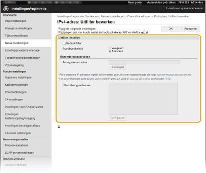 Als u IP-adressen verkeerd invoert, kunt u het apparaat mogelijk niet bereiken vanuit de UI op afstand. Om dat op te lossen, moet u <IPv4-adresfilter> of <IPv6-adresfilter> instellen op <Uit>.