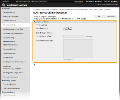 Als u MAC-adressen verkeerd invoert, kunt u het apparaat mogelijk niet bereiken vanuit de UI op afstand. Om dat op te lossen, moet u <MAC-adresfilter> instelln op <Uit>. <MAC-adresfilter>