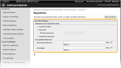 Voer een wachtwoord voor versleuteling van de exportdata in met behulp van alfanumerieke tekens. Voer hetzelfde wachtwoord in [Bevestigen]. Als het selectievakje [Adresboek] of [Instellingen/registratie] is ingeschakeld, kunnen de gegevens niet worden geëxporteerd zonder dat een encryptiewachtwoord is ingesteld.