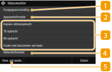 Wanneer u <Statusmonitor> selecteert, wordt er een scherm weergegeven waarin u de voortgang kunt controleren van documenten, en ook de status van het apparaat (resterende hoeveelheid toner in de tonercartridge, enzovoort) en netwerkinstellingen, zoals het IP-adres van het apparaat.