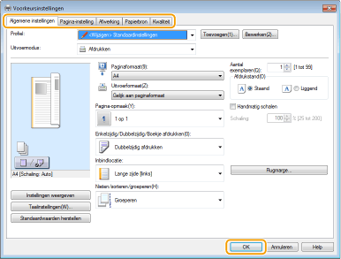 Selecteer het printerstuurprogramma voor dit apparaat en klik op [Voorkeursinstellingen] of [Eigenschappen].
