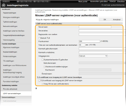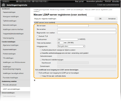 LDAP serverregistratie moet afzonderlijk worden verricht, hetzij om te zoeken, hetzij voor verificatie. Als u een LDAP-server wilt gebruiken voor het zoeken naar fax- en e-mailbestemmingen, registreer de server dan voor zoeken, en als u de server wilt gebruiken voor het verifiëren van verzenden van e-mail of faxen, registreer de server dan voor verifiëren.