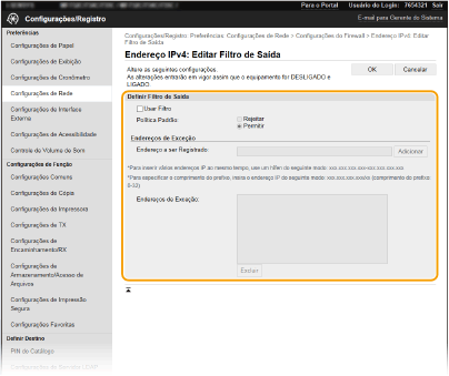 Se os endereços IP não forem introduzidos corretamente, pode não conseguir aceder à máquina a partir da UI Remota; nesse caso, tem de definir <Filtro de Endereço IPv4> ou <Filtro de Endereço IPv6> para <Desativ.>.