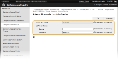 [Alterar Senha] Para definir ou alterar a palavra-passe, selecione a caixa de verificação e introduza carateres alfanuméricos para a nova palavra-passe nas caixas de texto [Senha] e [Confirmar].