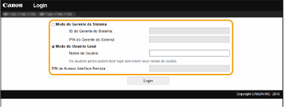 Selecione [Modo do Gerente do Sistema] ou [Modo do Usuário Geral] e introduza um valor em [PIN de Acesso à Interface Remota], conforme necessário.
