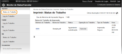 Clique em [Número do Trabalho] nos documentos em pausa e proteja os documentos para apresentar informação detalhada. Pode verificar o nome de utilizador e a contagem de páginas do documento impresso.