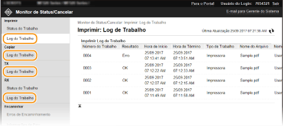 Os registos dos trabalhos de impressão, cópia, envio (TX) e receção (RX) são apresentados.