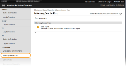 Quando ocorre um erro, esta página é apresentada clicando na mensagem que aparece em [Informações de Erro] na página do portal (página principal).