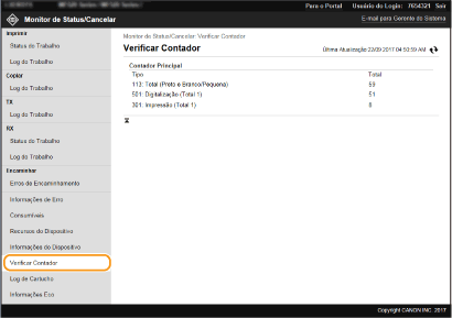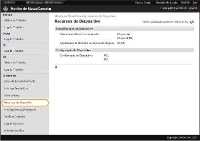 São apresentadas informações relativas à máquina e ao administrador de sistema. O nome do dispositivo e outras informações de administrador do sistema apresentadas aqui correspondem às definições em [Informações do Gerente do Sistema] na página [Gerenciamento de Usuários] ou em [Configurações de Informações do Dispositivo] na página [Gerenciamento de Dispositivo].