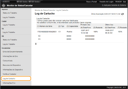 Pode verificar os registos de utilização das cartridges de toner e outros registos.