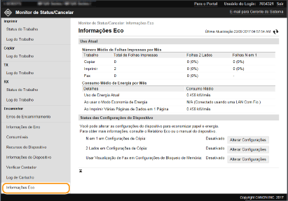 É apresentado o volume total mensal de impressões e o consumo total mensal de energia. Pode apresentar o ecrã de informações ecológicas e alterar as definições para reduzir o consumo de papel e energia.