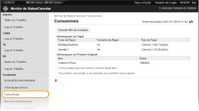 É apresentada a informação de tamanho e tipo de papel para a origem do papel, número de modelo do cartucho de toner, etc. Também pode clicar em [Verificar Detalhes de Consumíveis] na página do portal (página principal) para aceder a esta página (