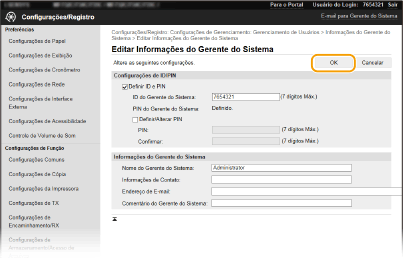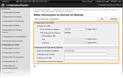 Algumas definições só podem ser alteradas depois de iniciar sessão no modo de administrador do sistema.