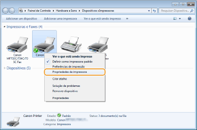 Clique com o botão direito do rato no ícone do controlador de impressora desta máquina e clique em [Propriedades de impressora] ou [Propriedades].
