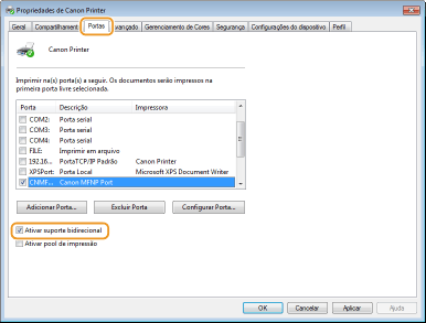 No separador [Portas], certifique-se de que a caixa de verificação [Ativar apoio bidirecional] está selecionada.