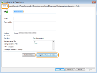 Clique em [Imprimir Página de Teste] no separador [Geral].