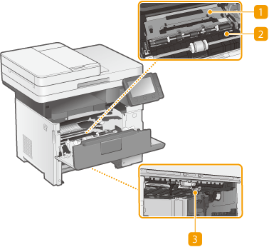 Se o papel estiver encravado dentro da máquina, levante o guia de transporte na direção da parte frontal da máquina para retirar o papel encravado.