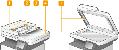 Alimenta automaticamente originais na máquina para digitalização. Quando são colocadas duas ou mais folhas de um original no alimentador, é possível digitalizar originais continuamente.