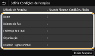 Nome, números de fax, endereços de correio eletrónico, nomes de organizações e unidade de organização são critérios disponíveis para procurar destinos.
