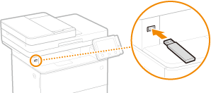 Manuseamento de dispositivos de memória USBCertifique-se de que o dispositivo de memória USB está orientado corretamente antes de introduzi-lo. Se tentar introduzi-lo na orientação errada, o dispositivo de memória e a máquina podem ficar danificados.