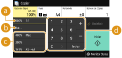 Pode ampliar ou reduzir cópias utilizando um rácio de cópia predefinido, como <A5->A4>, ou definindo um rácio de cópia personalizado em incrementos de 1%.