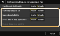 Especifique se pretende ativar a função de receção na memória apenas durante um período de tempo específico. Selecione <Ativado> para ativar a função de receção na memória apenas durante o período de tempo especificado em <Hora de Bloqueio de Memória>.
