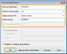 Defina o modo de comunicação e o número de fax (ou URI) e clique em [OK].